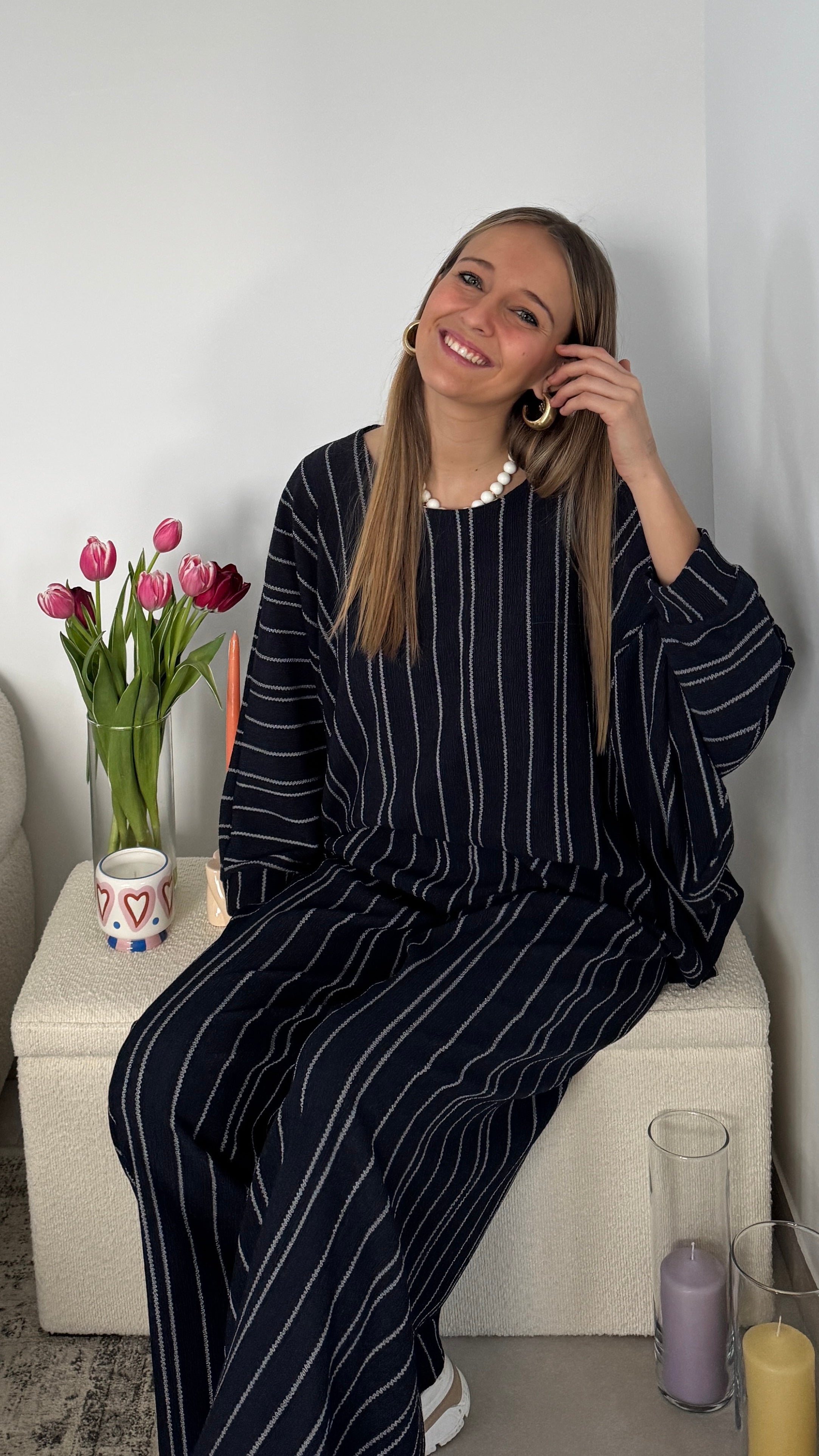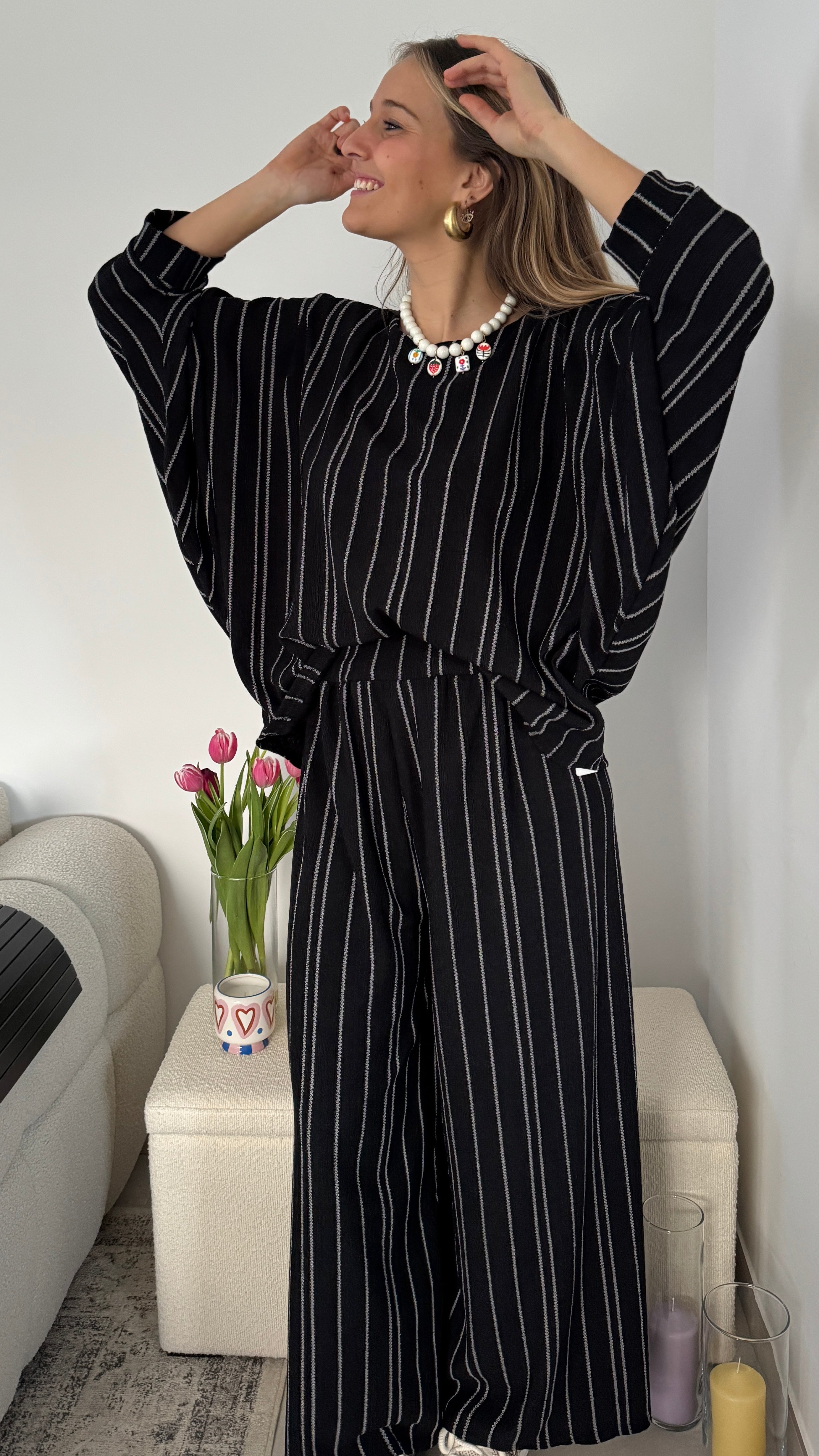 Cet ensemble noir à fines rayures verticales est la pièce parfaite pour un look chic sans effort. Composé d’un top fluide à manches amples et d’un pantalon large assorti, il allonge la silhouette tout en offrant un confort absolu.