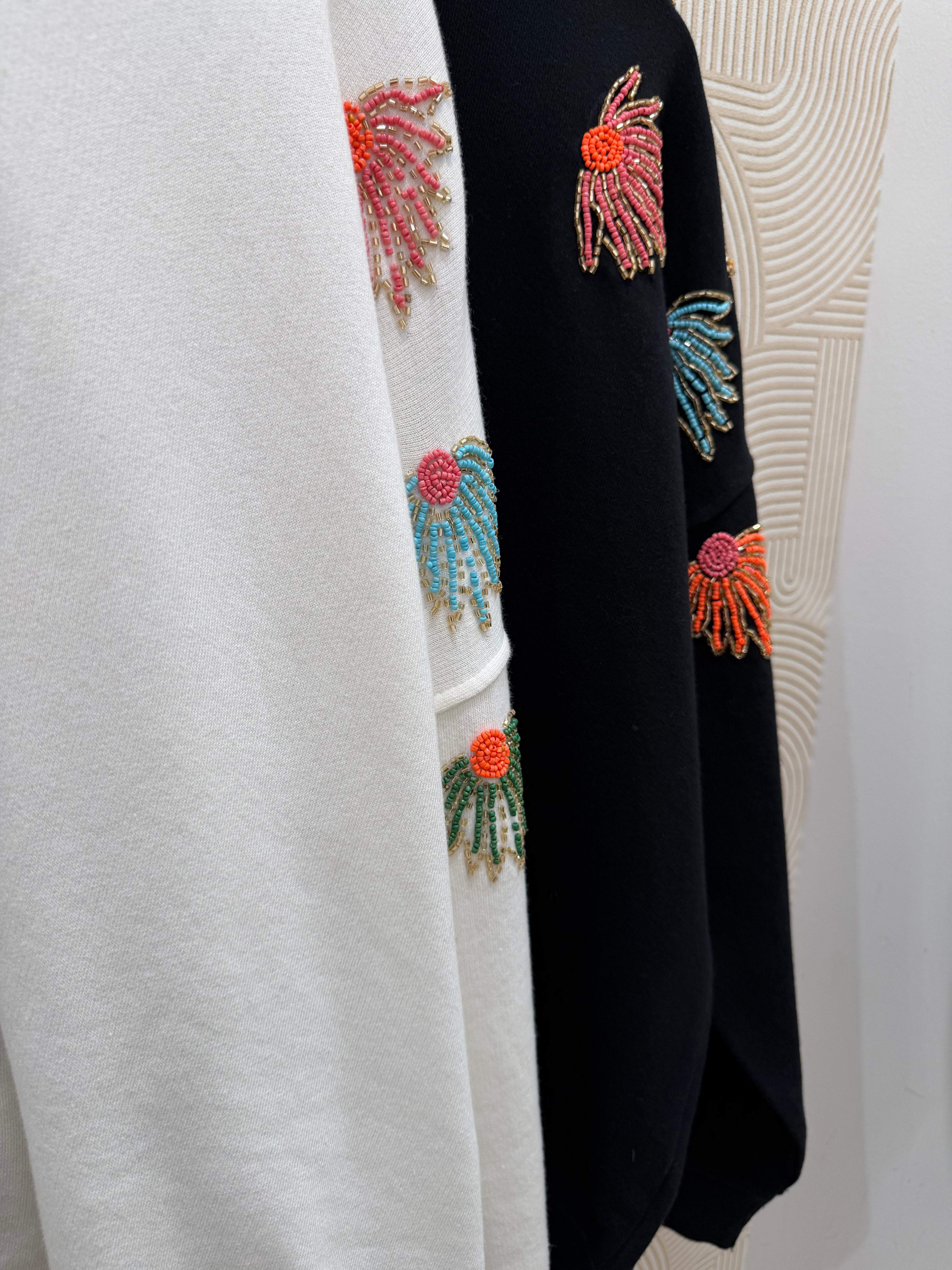 Minimaliste à l’avant et spectaculaire sur les détails, ce pull mixe confort casual et touche bohème chic. Les broderies façon fleurs / feuillage en perles multicolores (orange, rose, turquoise, violet…) apportent du relief et une vraie signature mode à la pièce.