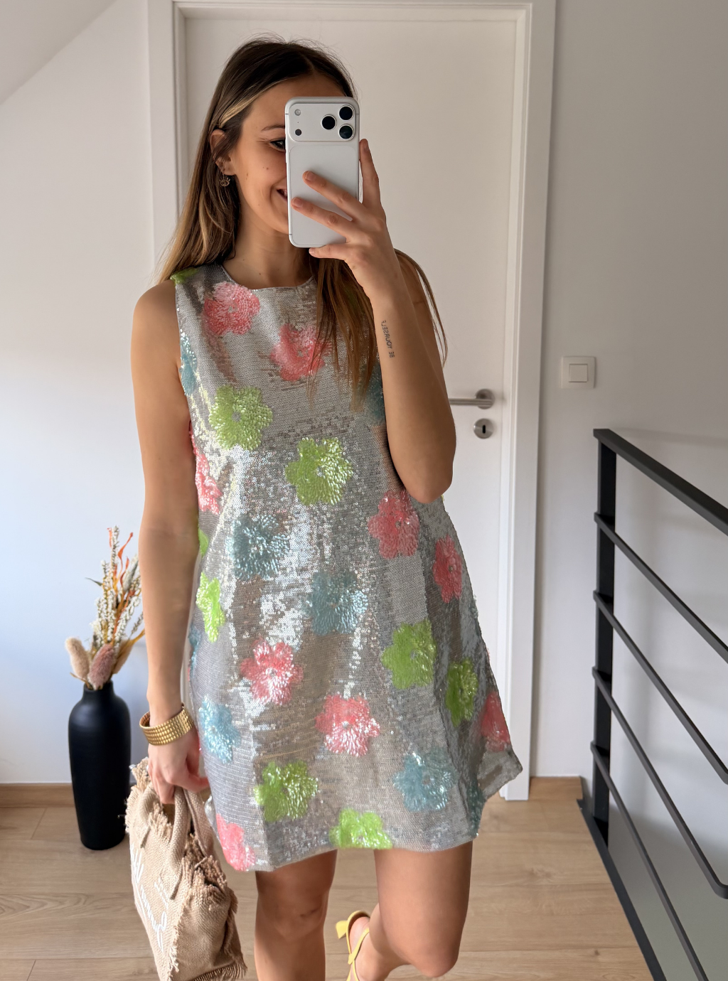 Robe courte à sequins argentés et motifs fleurs colorés, parfaite pour illuminer vos looks avec originalité.
