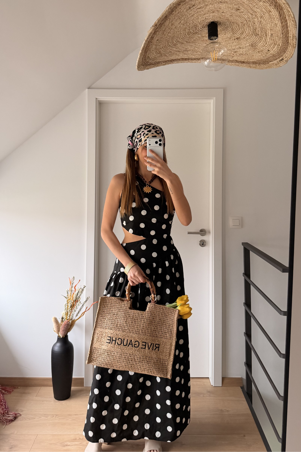 Robe longue noire à pois blancs, féminine et élégante, avec une coupe fluide qui sublime la silhouette.