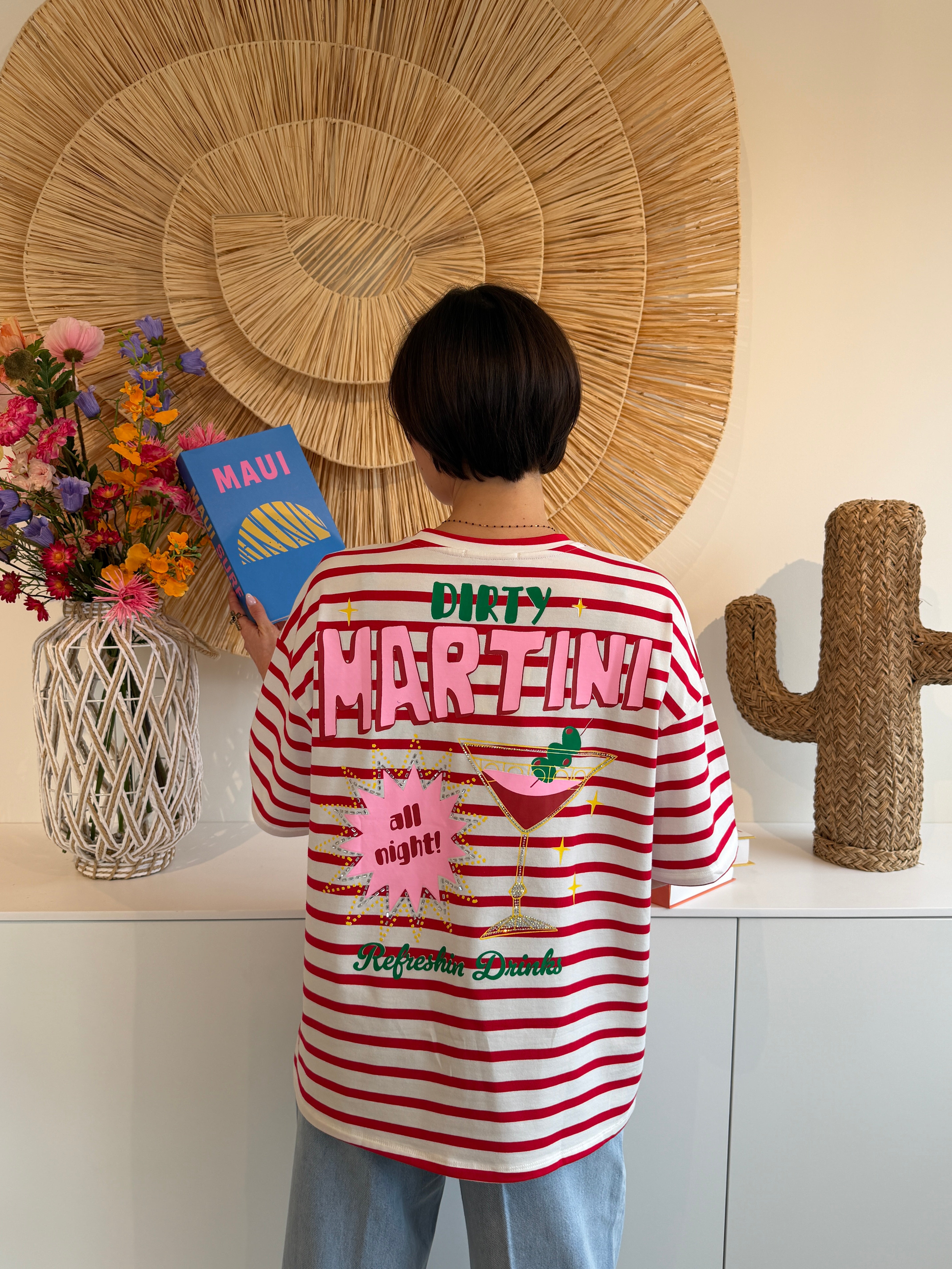 T-shirt à rayures rouges et blanches, à coupe ample et esprit décontracté. Il se distingue par son grand imprimé au dos “Dirty Martini” accompagné d’un visuel cocktail coloré et de détails graphiques fun, pour un style original et plein de caractère.