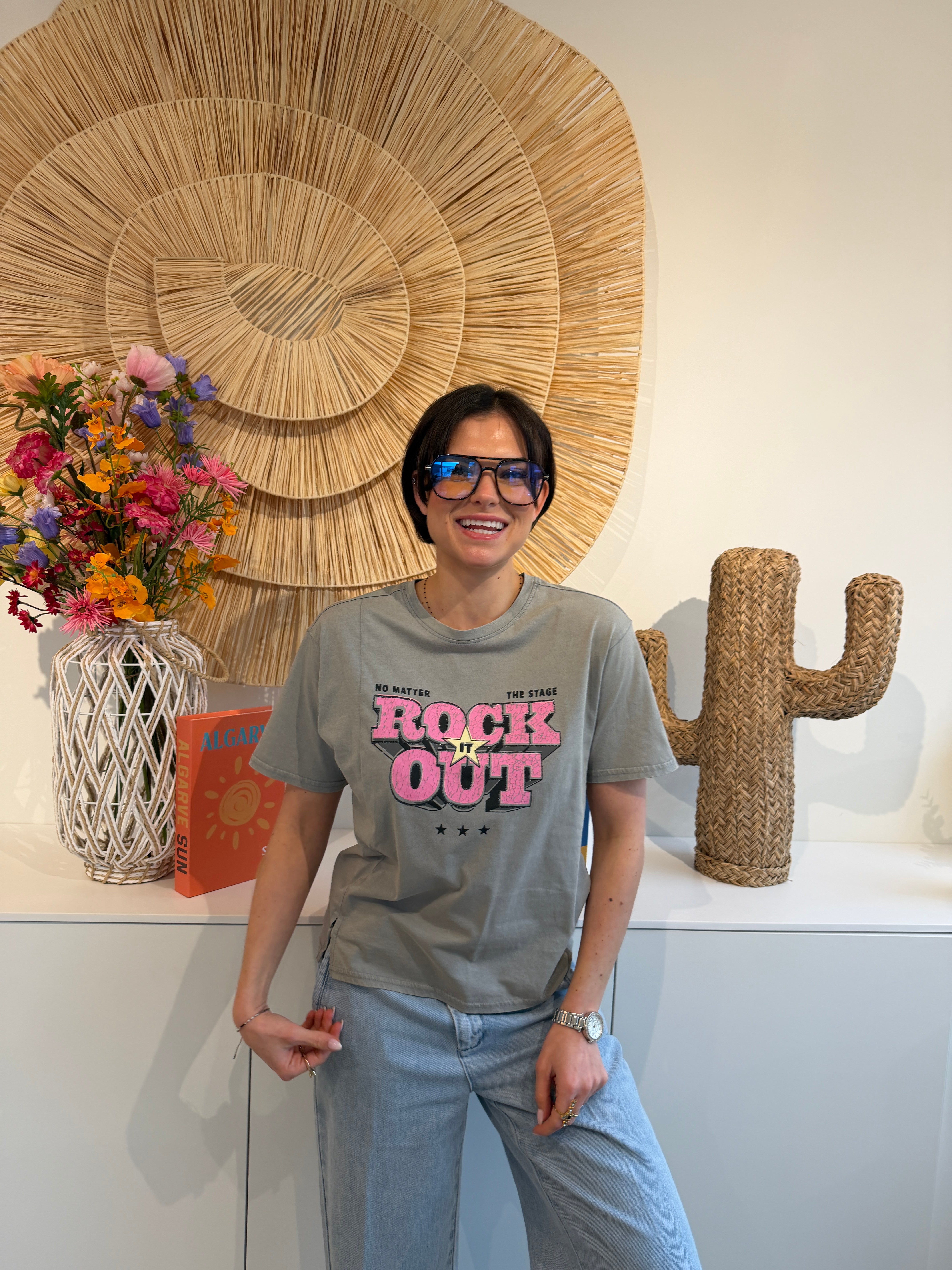 T-shirt gris à coupe droite, orné d’un imprimé graphique “Rock It Out” aux accents rose et noir pour un esprit dynamique et affirmé. Un modèle au style casual avec une touche vintage, idéal pour donner du caractère à vos tenues du quotidien.