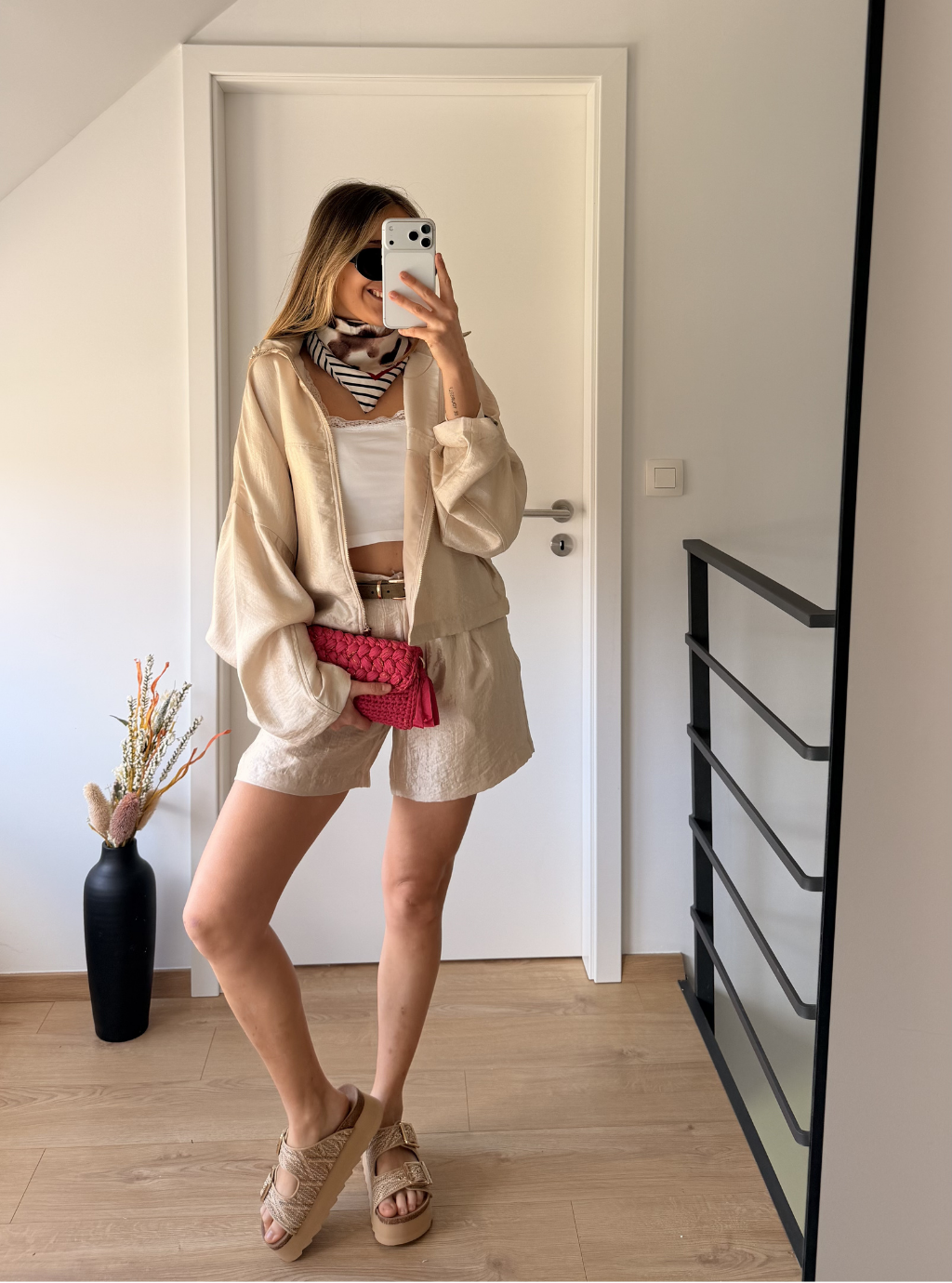 Cette veste beige au fini légèrement satiné apporte une touche élégante et lumineuse à votre tenue. Avec sa coupe décontractée et son style moderne, elle est parfaite pour un look à la fois chic et tendance